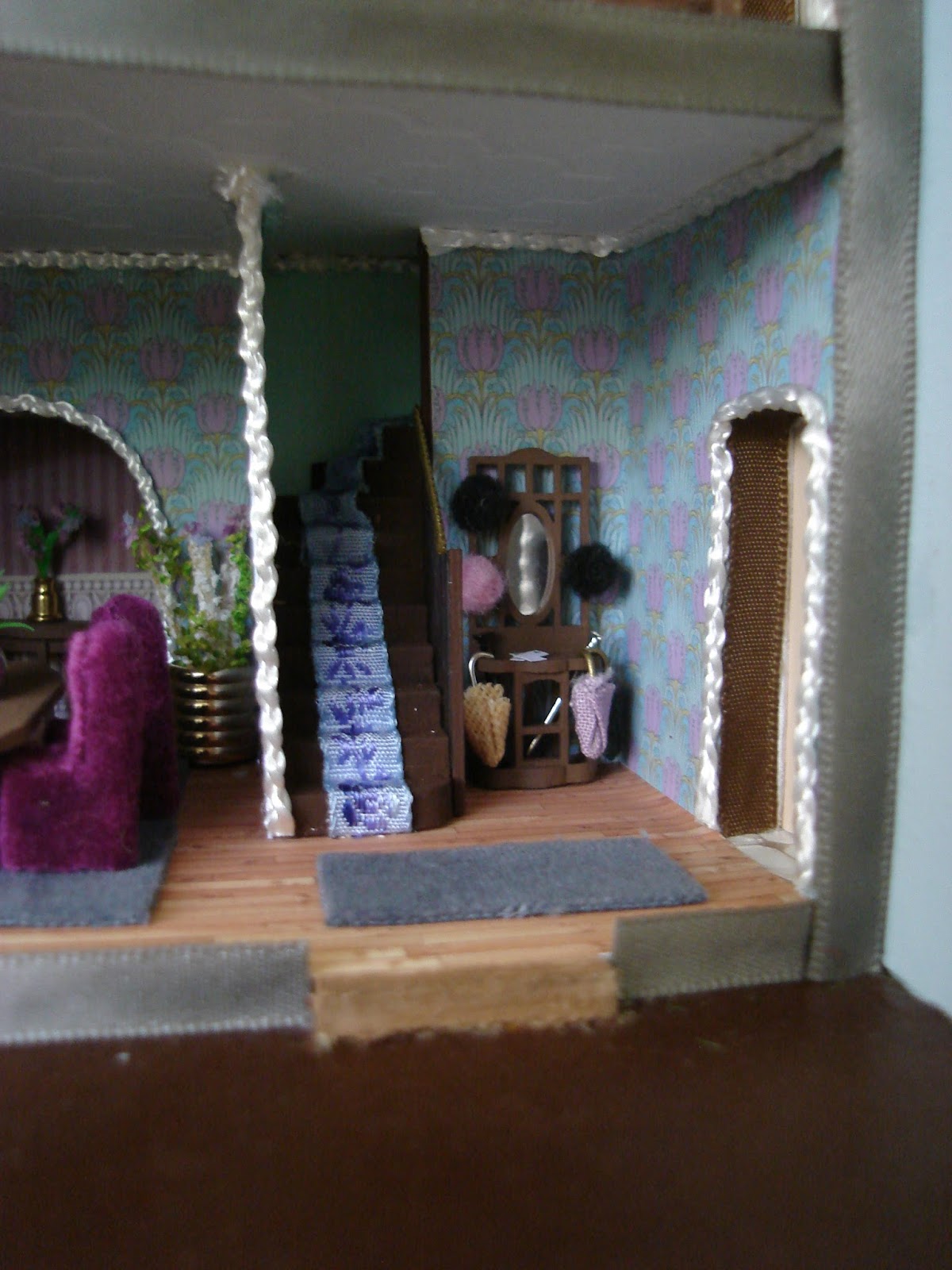 The entry hall area has steps leading up to the next floor. These are another kit from Petite Propeties intended to be used in the Le Petit Palais kit. The hall stand by the stairs is another PP kit and is decorated with tiny umbrellas and felt hats.