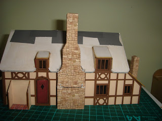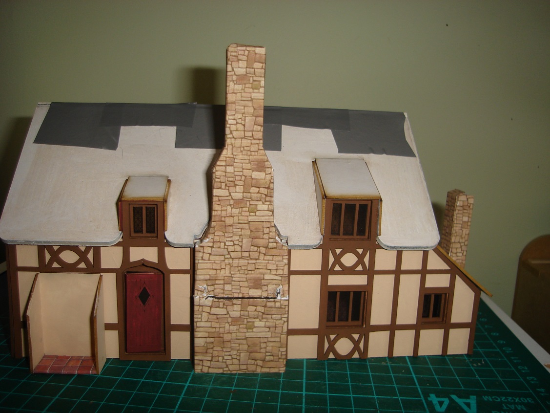 And my other current project, the 48th scale Woodnock Cottage, now has thatching on it's roof and is ready to have furniture added inside. (And for an idea of scale, the blue surface you can see under the cottage is the top of the Workshop).