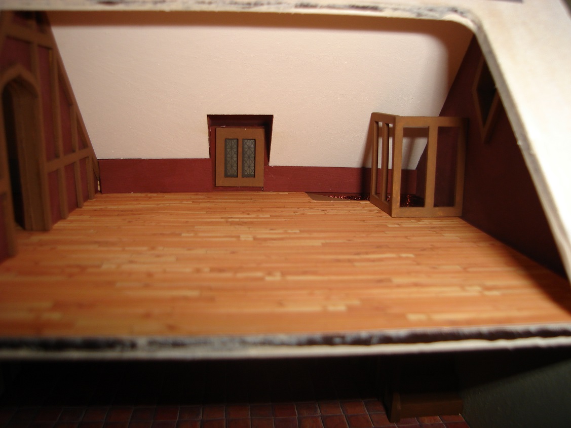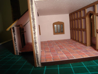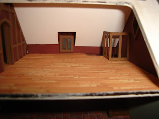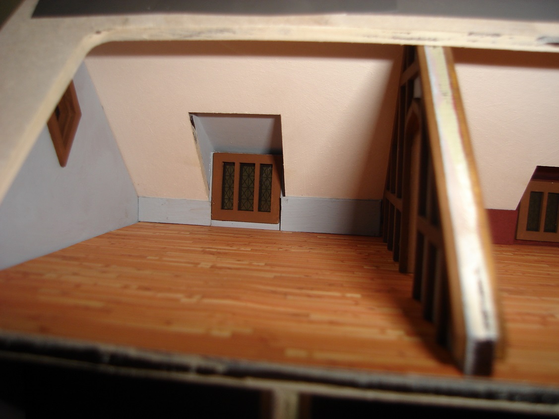 The top floor of the main house holds the bedroom. Like the two levels below it I added a fake wall at the back of the room, this time to block off the sloped roof at the back and instead have a straight rear wall. A rather unconvincing fake door connects this room to the rest of the house. Due to the supports inside the removable roof I couldn't add too much furniture at the front of the room or it would be pushed askew every time the roof was put in place.