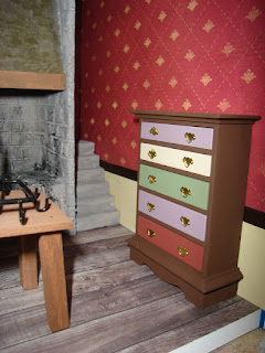 Opening off the bedroom in the tower is the dressing room. This room definitely needs a little something more but at this point I haven't thought what I might successfully do in such a small scale. In the back corner is a balsa wood ladder leading up to the top room in the tower.