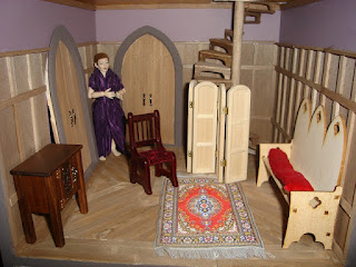 Putting the clay aside, I spent some time rearranging furniture. The layout of the shop has changed again. Yes, again. The units that were to be on the back wall are now along the side wall and visa versa. Hopefully this will be the last, final change of layout in the shop. Maybe. In the Centre Room of the castle I played around with possiblities. Rumaging in my furniture box I found a kit gothic bench seat I bought about two years ago. If I were to use this seat to make this room a Sitting room it would look something like this: